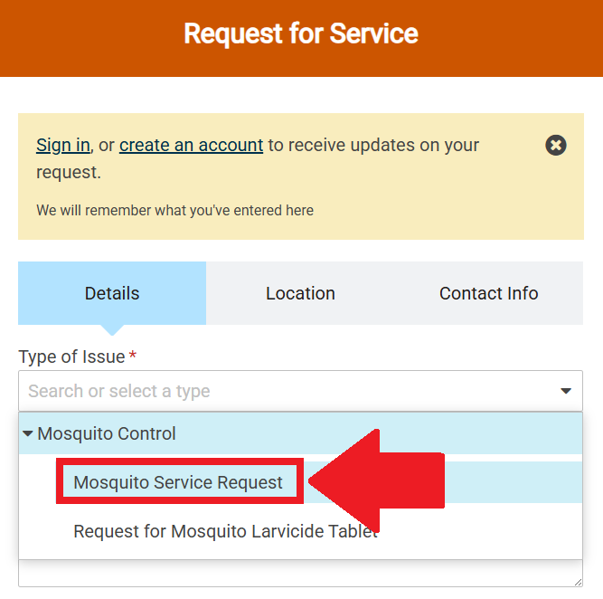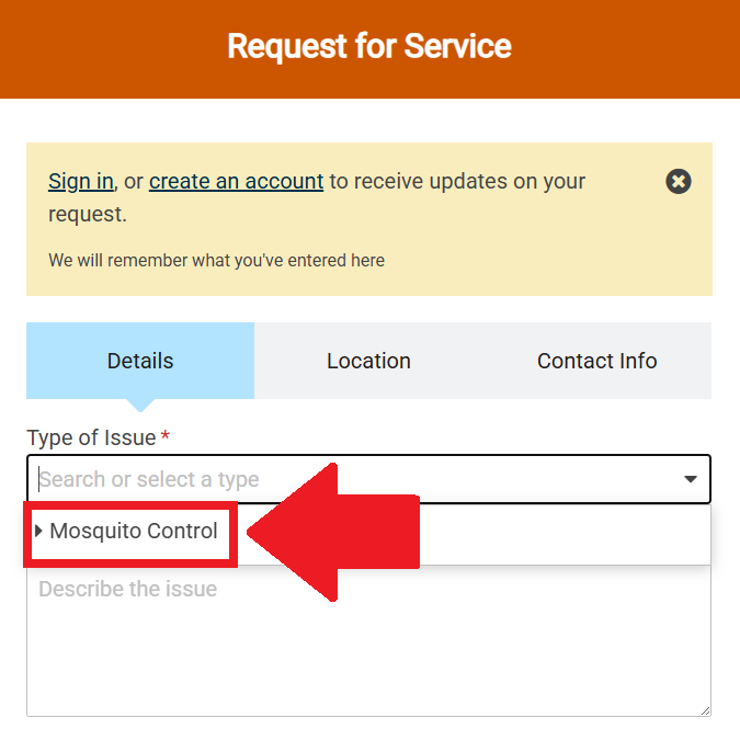 - Click the drop down menu under Type of Issue and select Mosquito Control:
