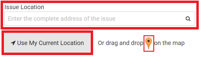 - On the next page, you can manually type in the address in the Issue Location field, click Use my Current Location or drag the orange icon onto the map below to provide the location address for your request: